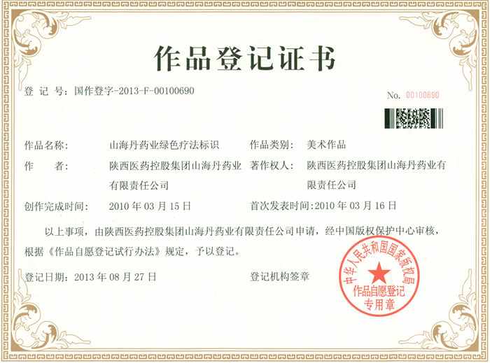 山海丹綠色療法標示知識產(chǎn)權(quán)證書