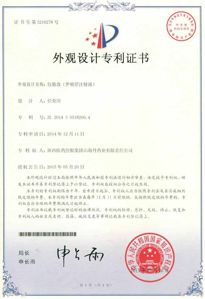 伊通舒注射液外觀設(shè)計(jì)專利證書