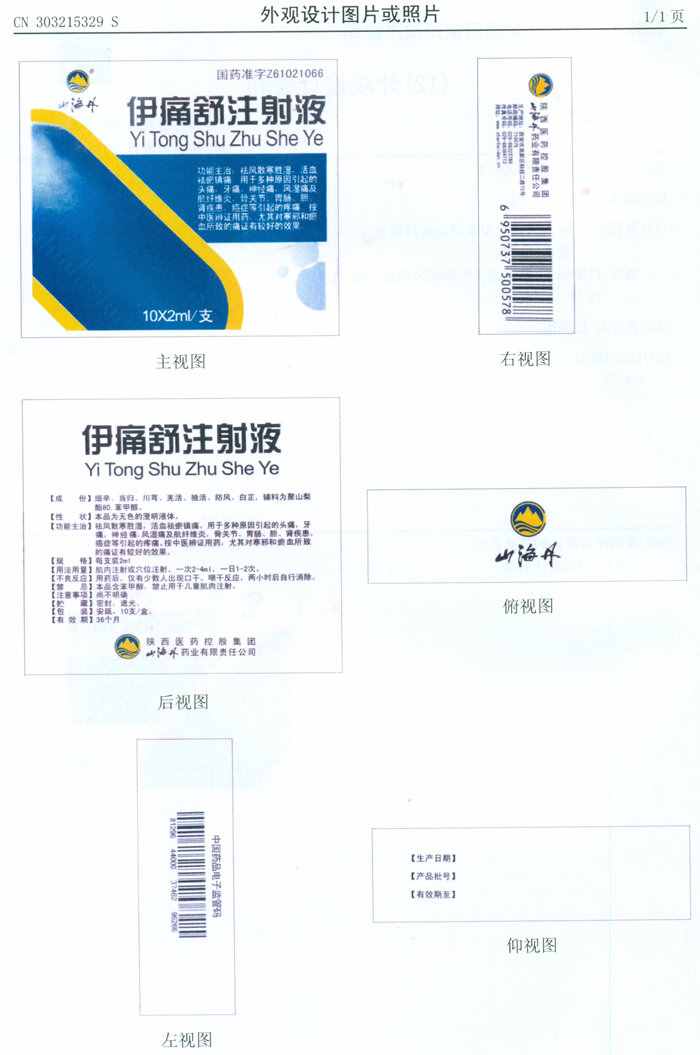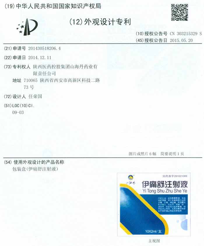 伊通舒注射液外觀設(shè)計(jì)專利證書